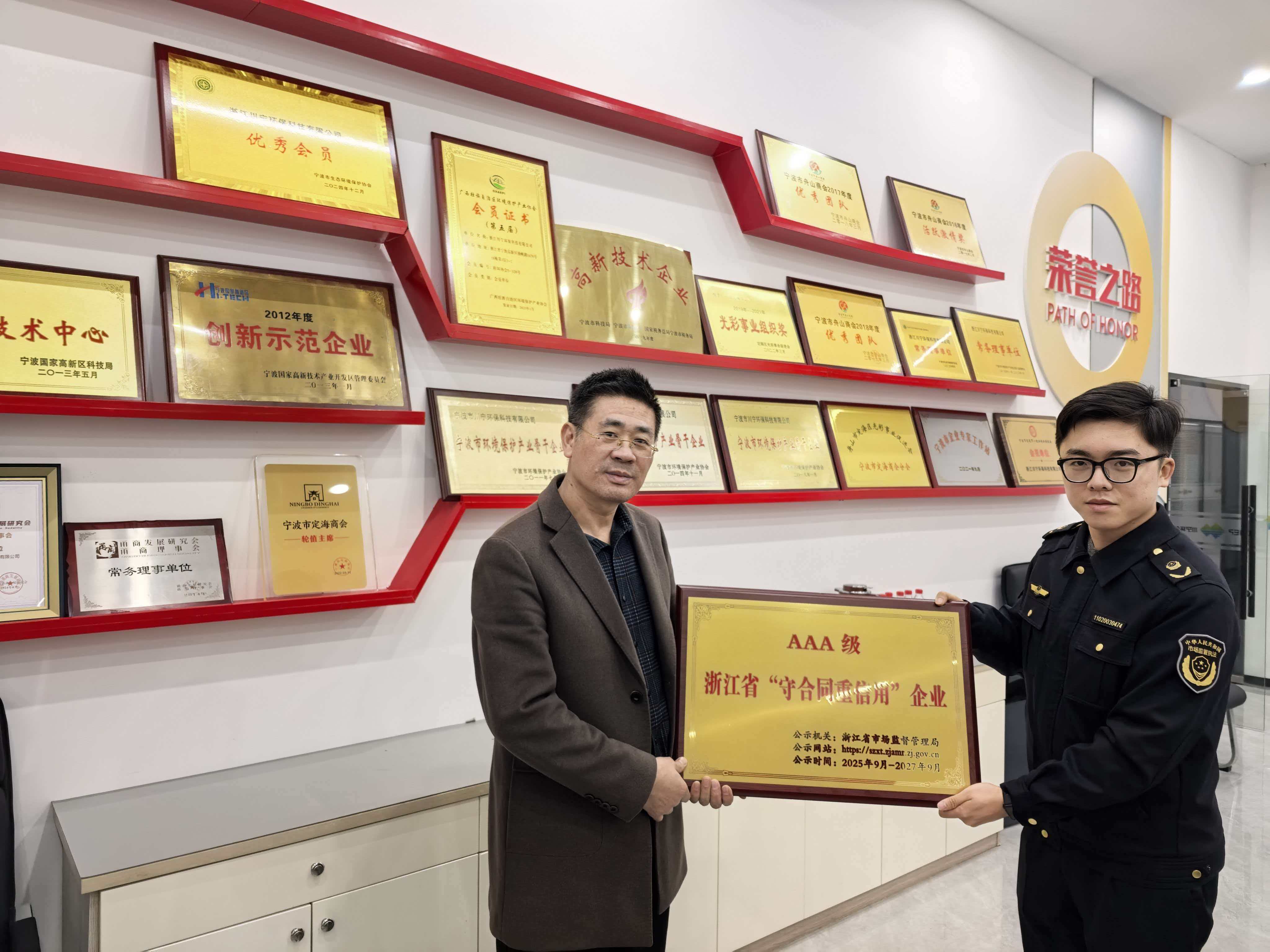 12月24日,寧波市高新區(qū)市場監(jiān)督管理局領導蒞臨浙江川寧環(huán)??萍加邢薰?,向我司頒發(fā)—浙江省AAA級“守合同重信用”榮譽牌匾。